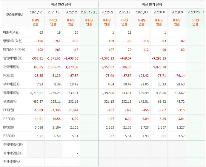 2022년 매출은 30억, 영업이익은 -435억, 당기순이익은 -417억입니다. 그리고 영업이익률은 -1438.66%입니다.