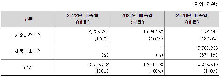 당사는 2018년 12월에 대웅제약과 궤양성 대장염 치료제 후보물질인 BBT-401에 대한 아시아 지역을 대상으로 하는 기술이전 및 공동개발 계약을 체결하였으며, 또한 2019년 7월에 글로벌 제약사인 베링거인겔하임과 특발성 폐섬유증 치료제 후보물질인 BBT-877에 대한 전세계 독점 개발 및 판권 등을 포함한 기술이전 계약을 체결하였습니다. 베링거인겔하임과의 계약은 2020년 11월에 종결되었으며, 2022년과 2021년 매출액은 수행의무 진행 및 마일스톤 달성에 따라 인식한 금액입니다.