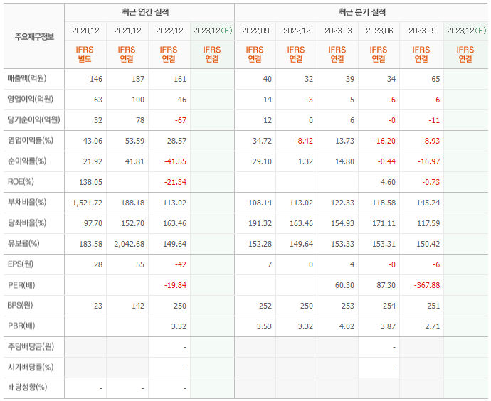 2022년 매출은 161억, 영업이익은 46억, 당기순이익은 -67억입니다. 그리고 영업이익률은 28.57%입니다.