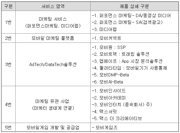 당사는 보고서 제출일 현재 주요 서비스 현황은 다음과 같습니다.