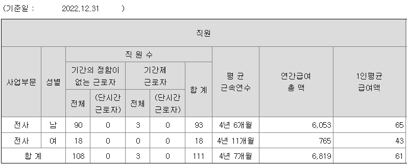 남성의 평균연봉은 6100만원이고 직원수는 93명, 여성은 4300만원이고 직원수는 18명입니다. 전체 평균연봉은 6100만원이고 직원수는 111명입니다.