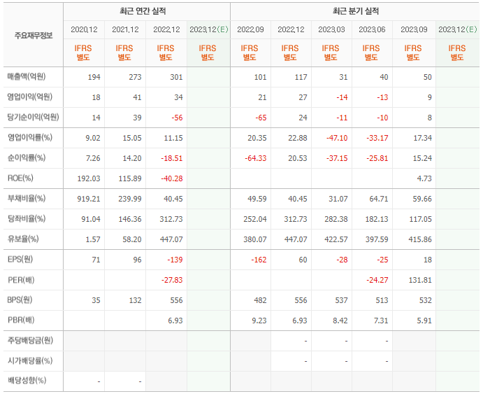 2022년 매출은 301억, 영업이익은 34억, 당기순이익은 -56억입니다. 그리고 영업이익률은 11.15%입니다.