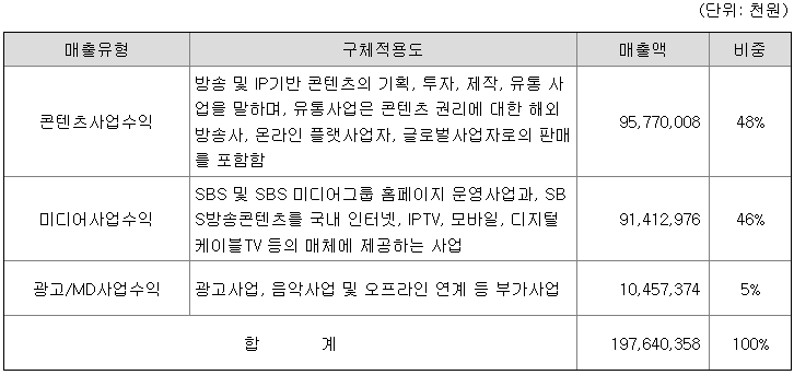연결기업은 방송콘텐츠의 기획, 투자, 제작, 유통 사업을 주요 사업목적으로 하고 있습니다. SBS방송콘텐츠 권리를 해외 방송사, 온라인 플랫폼사업자, 글로벌사업자 등에게 제공하는 콘텐츠사업과 국내 IPTV, 모바일, 디지털케이블TV 등 매체에 제공하는 미디어사업, SBS 및 SBS 미디어그룹 홈페이지 운영사업, 광고사업, 음악사업, 콘텐츠와 연계한 오프라인 부가사업 등을 영위하고 있습니다.