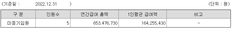 미등기임원의 평균연봉은 1억 6425만원이고 직원수는 5명입니다.