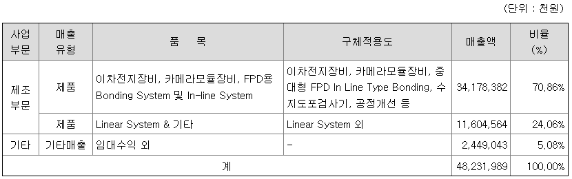 당사는 1995년 2월에 창업하여 27년의 업력이 있으며, 주 사업장은 안산 사업장(안산시 상록구)으로 이차전지장비, 카메라모듈장비, FPD(Flat Panel Display평판디스플레이)용 Bonding System 및 In-line System, Linear System, Probe, Laser System, 산업용로보트가 주요제품입니다.