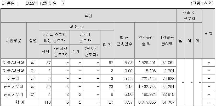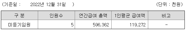 미등기임원의 평균연봉은 1억 1927만원이고 직원수는 5명입니다.