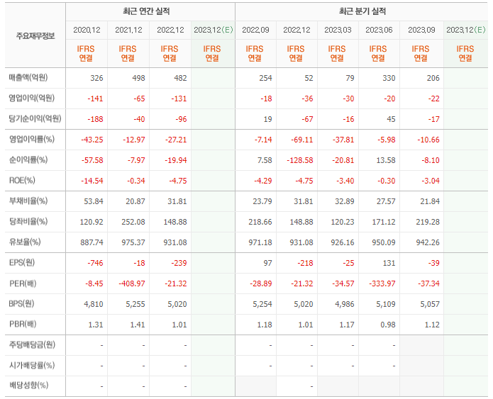 2022년 매출은 482억, 영업이익은 -131억, 당기순이익은 -96억입니다. 그리고 영업이익률은 -27.21%입니다.