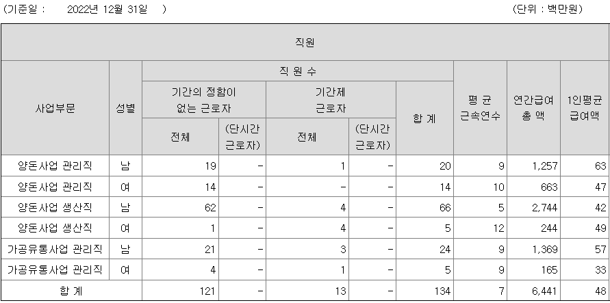 당사는 수직계열화된 육돈전문회사로서 양돈의 생산, 사육, 판매 및 축산물종합처리장(LPC)을 통한 축산물 가공유통사업을 영위하는 회사입니다. 회사는 2005년 양돈업을 시작하여 현재 직영농장 22개와 위탁농장을 운영하고 있으며, 2015년말 강원엘피씨를 합병하여 부분육 브랜드시장에 진출할 수 있는 기반을 완성하였습니다. 우수한 품질의 원종돈을 보유하여 2022년 기준 MSY 23.1두의 높은 생산성(MSY-모돈 두당 1년간 비육돈 출하두수)과 1등급비율 76.6%의 고품질 양돈을 생산하고 있으며, 사육부터 유통단계까지의 전 과정에 대한 HACCP 인증을 받아 계속해서 유지해가며 소비자들에게 보다 위생적이고 안전한 고품질 돈육을 제공하고 있습니다.