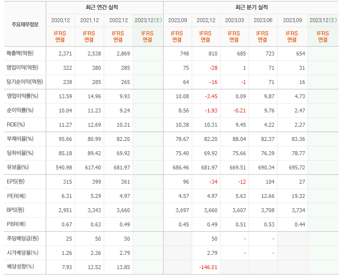 2022년 매출은 2869억, 영업이익은 285억, 당기순이익은 265억입니다. 그리고 영업이익률은 9.93%입니다.