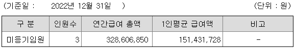 미등기임원의 평균연봉은 1억 5143만원이고 직원수는 3명입니다.