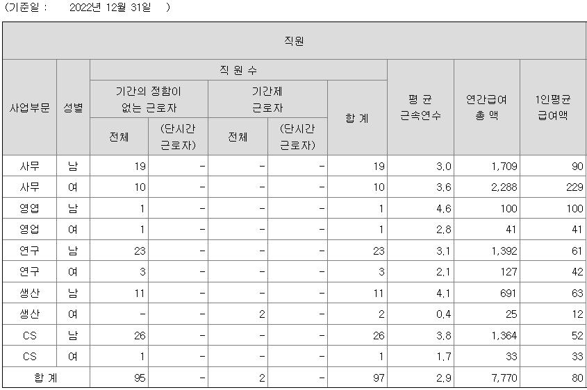 전체 평균연봉은 8000만원이고 직원수는 97명입니다.