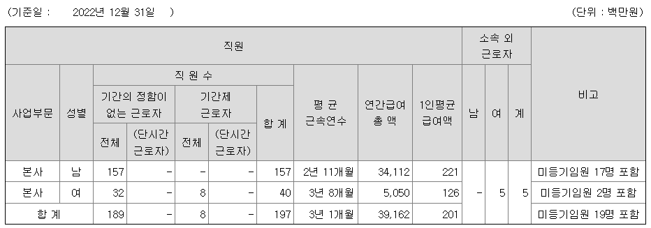 | 사업부문 | 성별 | 직원수 | 평균근속연수 | 평균연봉(백만) |