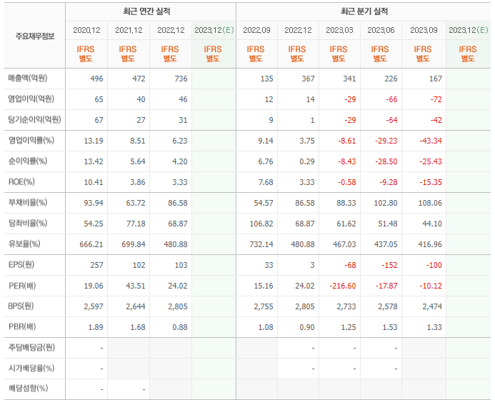 2022년 매출은 736억, 영업이익은 46억, 당기순이익은 31억입니다. 그리고 영업이익률은 6.23%입니다.