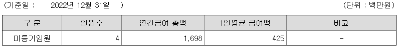 미등기임원의 평균연봉은 4억 2500만원이고 직원수는 4명입니다.