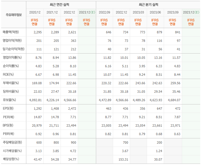 2022년 매출은 2621억, 영업이익은 363억, 당기순이익은 212억입니다. 그리고 영업이익률은 13.86%입니다.