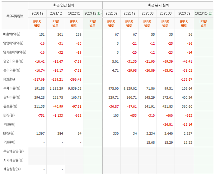 2022년 매출은 259억, 영업이익은 -20억, 당기순이익은 -19억입니다. 그리고 영업이익률은 -7.89%입니다.