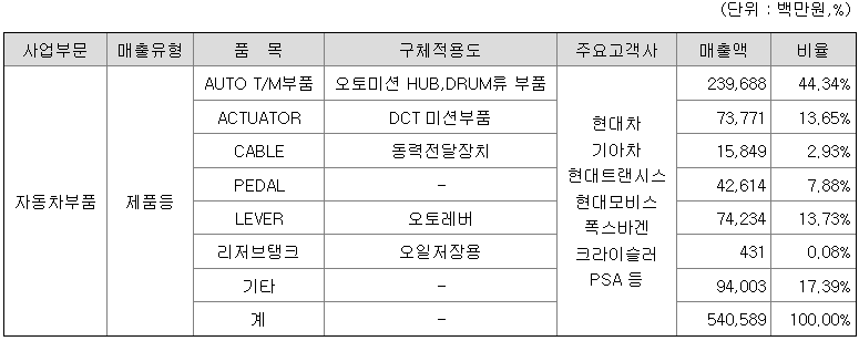당사는 AUTO T/M부품, ACTUATOR, CABLE, PEDAL, 리저브탱크, LEVER등 자동차부품을 생산, 판매하고 있습니다. 각 제품별 매출액 및 총 매출액에서 차지하는 비율은 다음과 같습니다.