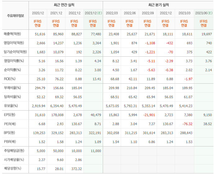 2022년 실적은 8조 8827억, 영업이익은 1236억입니다. 그리고 영업이익률은 1.39%입니다.
