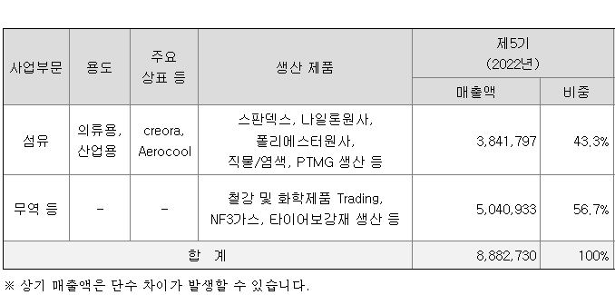 당사의 사업부문은 섬유 부문과 무역 등 부문으로 나누어져 있으며, 섬유 부문의 주요 제품은 스판덱스, 나일론원사, 폴리에스터원사, PTMG 등 입니다. 무역 등 부문의 주요 사업내용은 철강 및 화학제품의 Trading이며, 그 외 주요 제품으로는 NF3가스, 타이어보강재 등이 있습니다.