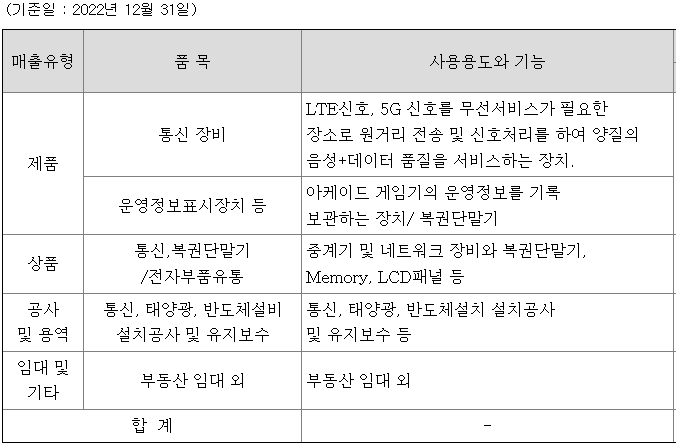 당사는 무선통신용 중계장치, 운영정보표시장치를 제조, 판매하는 통신사업과 전자부품 유통사업, 중계기 설치 및 정보통신공사, 전기공사, ESS, 태양광산업, 부동산 임대업을 하는 기타사업으로 구성되어 있습니다.