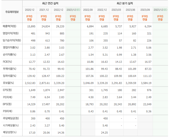 2022년 매출은 2조 9220억, 영업이익은 885억, 당기순이익은 780억입니다. 그리고 영업이익률은 3.03%입니다.