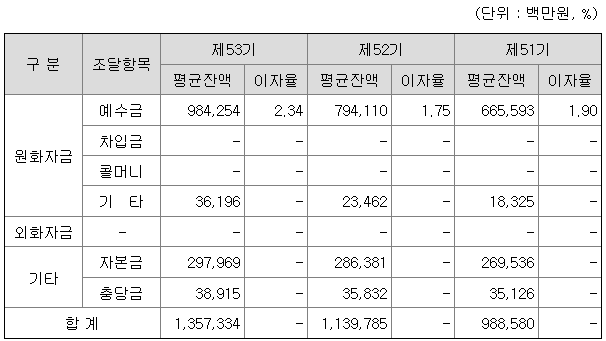당 저축은행의 주요 자금조달 수단은 예금상품을 통한 고객 예수금이며, 자금운용은 대출 및 금융기관 예치금이나 유가증권 운용입니다.  내용은 다음의 표를 통하여 살펴볼 수 있습니다.