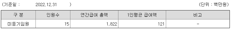 미등기임원의 평균연봉은 1억 2100만원이고 직원수는 15명입니다.