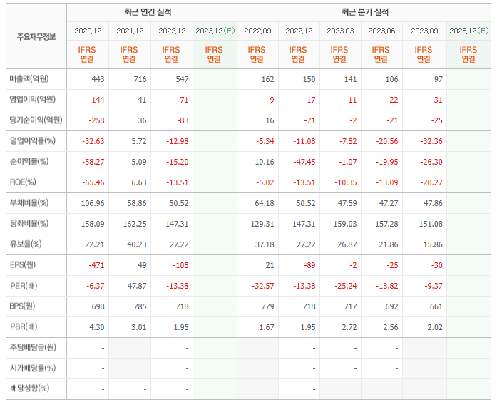 2022년 매출은 547억, 영업이익은 -71억, 당기순이익은 -83억입니다. 그리고 영업이익률은 -12.98%입니다.
