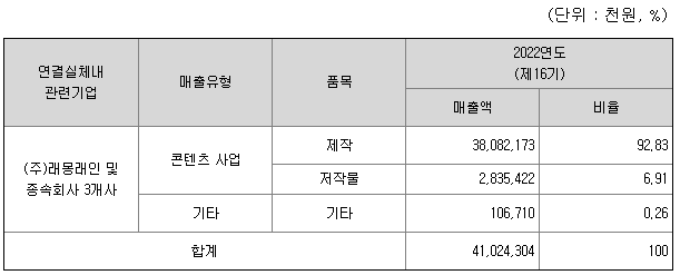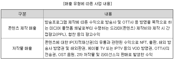 연결실체의 주요 제품은 드라마, 예능, 공연 콘텐츠로 이를 기획 및 제작하여 방송국과 미디어 플랫폼, 해외시장에 공급하고 콘텐츠 IP를 활용하여 NFT, 출판, 드라마 OST 음원, 음반 제작, 유통 서비스, 캐릭터 상품 등의 IP 부가사업을 영위하는 방송영상물 콘텐츠 사업을 주 사업으로 하고 있습니다.