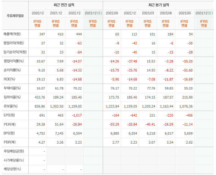 2022년 매출은 444억, 영업이익은 -63억, 당기순이익은 -64억입니다. 그리고 영업이익률은 -14.07%입니다.