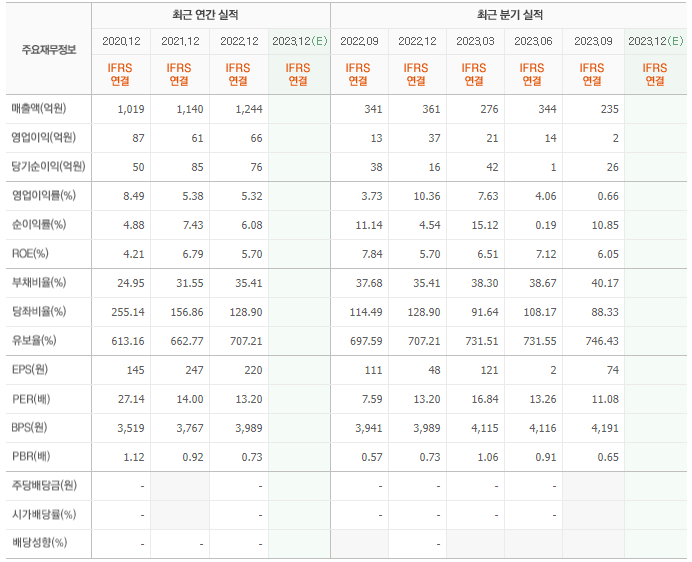 2022년 매출은 1244억, 영업이익은 66억, 당기순이익은 76억입니다. 그리고 영업이익률은 5.32%입니다.