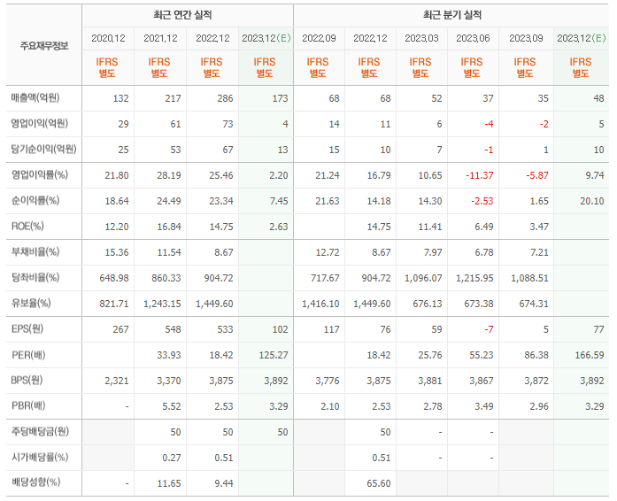 2022년 매출은 286억, 영업이익은 73억, 당기순이익은 67억입니다. 그리고 영업이익률은 25.46%입니다.