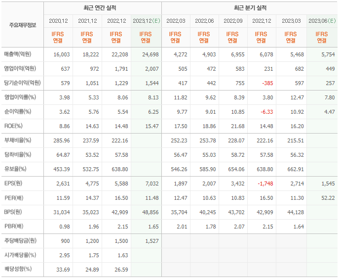 2022년 실적은 2조 2208억, 영업이익은 1791억입니다. 그리고 영업이익률은 8.06%입니다.