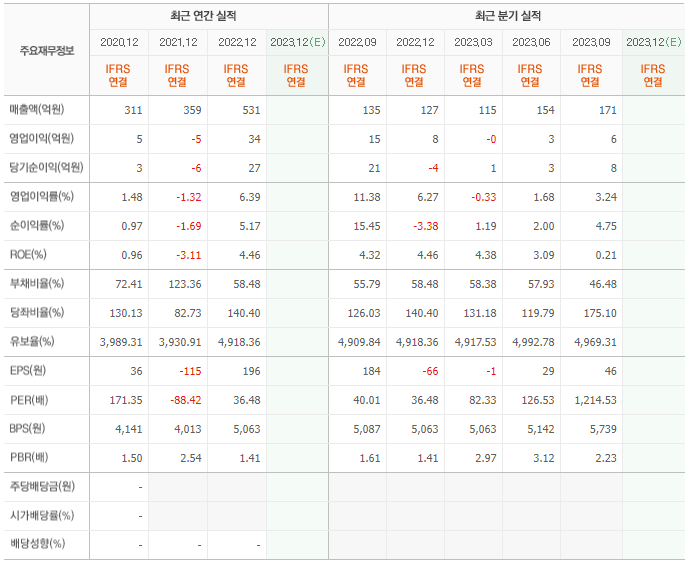 2022년 매출은 531억, 영업이익은 34억, 당기순이익은 27억입니다. 그리고 영업이익률은 6.39%입니다.