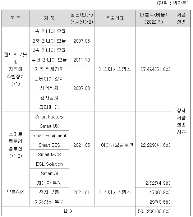 당사는 1988년 설립되어 주로 디스플레이 산업 물류자동화 사업을 영위하였으며 축적된 기술력을 바탕으로 자체 개발한 고속 갠트리 로봇용 리니어 모듈을 활용하여 자동차, 디스플레이, 공작기계 산업 분야 등 다양한 산업의 제조현장에서 제품 또는 소재의 자동 이송작업을 수행하기 위해 폭 넓게 사용되는 갠트리 로봇 시스템을 주축으로 하는 산업자동화 시스템 사업을 주력으로 영위하여 왔습니다.