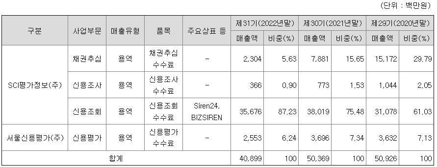 당사는 「신용정보법」등에 근거하여 사업을 영위하고 있고, 주요 사업으로는 신용정보업(신용조회업, 신용조사업) 및 채권추심업과 「자산유동화법」에 따른 자산관리위탁계약을 통한 유동화자산 관리 업무 및 「정보통신망법」에 따라 본인확인기관으로 지정되어 관련 본인확인업무 등을 영위하고 있습니다.