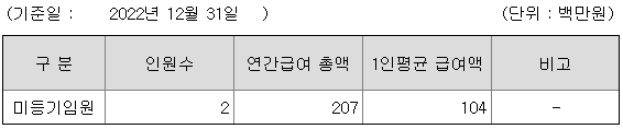 미등기임원의 평균연봉은 1억 400만원이고 직원수는 2명입니다.