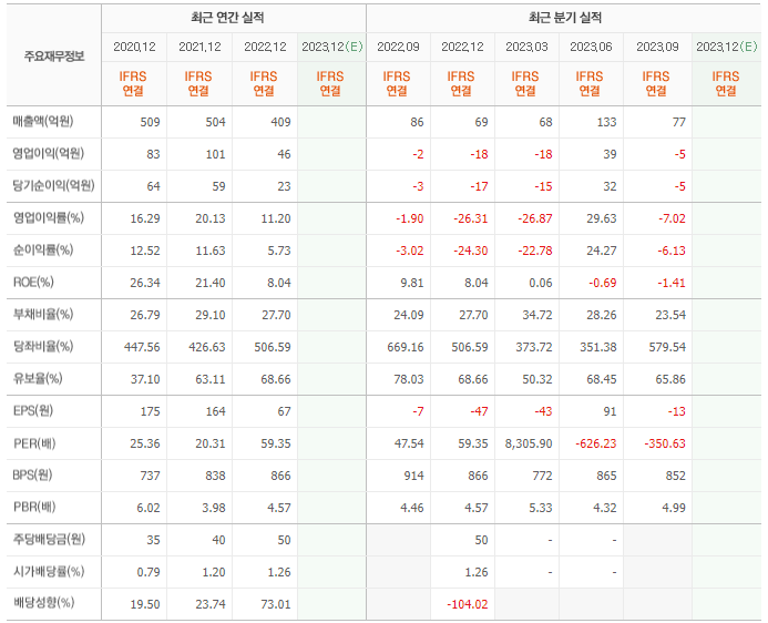 2022년 매출은 409억, 영업이익은 46억, 당기순이익은 23억입니다. 그리고 영업이익률은 11.20%입니다.
