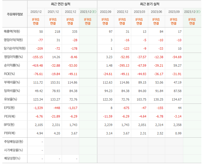 2022년 매출은 335억, 영업이익은 -28억, 당기순이익은 -178억입니다. 그리고 영업이익률은 -8.46%입니다.