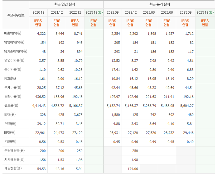 2022년 매출은 8741억, 영업이익은 943억, 당기순이익은 894억입니다. 그리고 영업이익률은 10.79%입니다.
