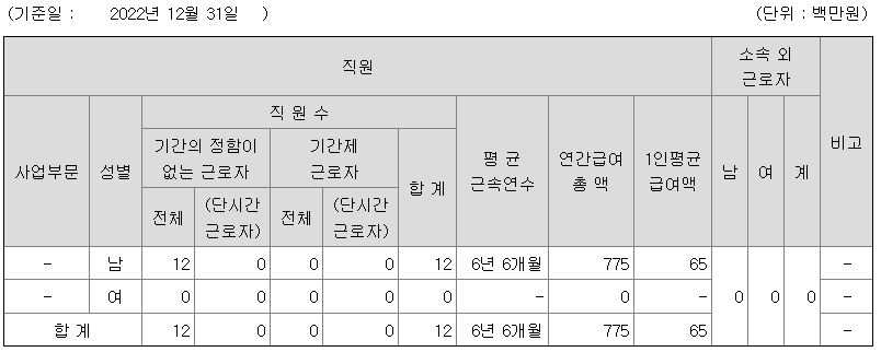 남성의 평균연봉은 6500만원이고 직원수는 12명, 여성은 0만원이고 직원수는 0명입니다. 전체 평균연봉은 6500만원이고 직원수는 12명입니다.