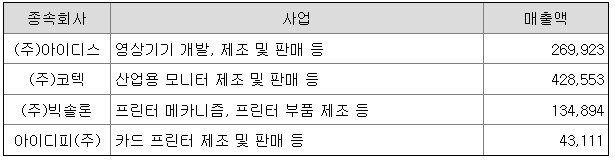 (주)아이디스홀딩스는 지배회사로서 다른 회사의 주식을 소유함으로써 다른 회사를 지배하는 것을 주된 목적으로 하고 있으며, 별도의 사업을 영위하지 않습니다. 주 수익원은 임대수익, 용역수익, 기타매출로 구성되어 있습니다.