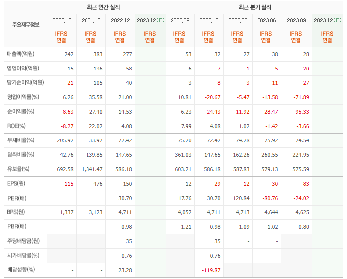 2022년 매출은 277억, 영업이익은 58억, 당기순이익은 40억입니다. 그리고 영업이익률은 21.00%입니다.