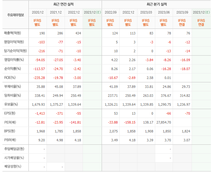 2022년 매출은 434억, 영업이익은 -15억, 당기순이익은 -10억입니다. 그리고 영업이익률은 -3.40%입니다.