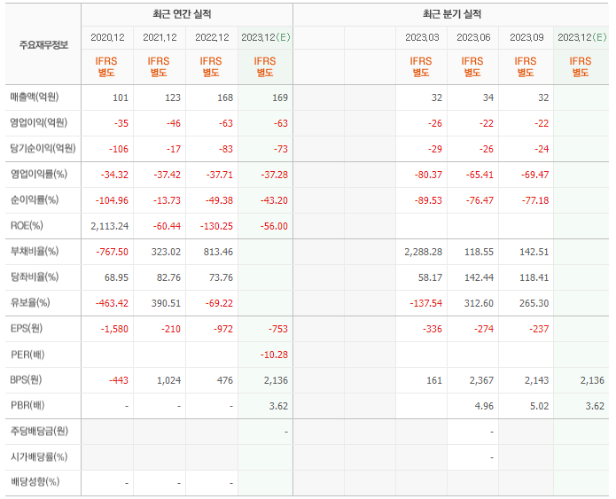 2022년 매출은 168억, 영업이익은 -63억, 당기순이익은 -83억입니다. 그리고 영업이익률은 -37.71%입니다.