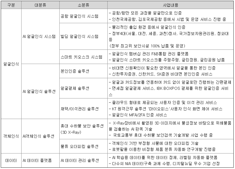 당사는 AI 알고리즘 개발, AI 학습데이터 구축/가공/정제, 얼굴인식 관련 하드웨어 및 소프트웨어의 설계, 개발을 영위하고 있는 AI 전문 기업입니다. 지금까지 AI Vision 중 얼굴인식 분야에 집중하여 개발을 진행해 왔으며, 이를 통해 글로벌 얼굴인식 분야에서 최고의 공신력을 얻고 있는 NIST(National Institute of Standards and Technology, 미국 국립표준기술연구소)의 FRVT(Face Recognition Vendor Test) 5개 부문에서 글로벌 1위((1:1 Verification Kiosk(21.11기준), 1:N Identification Visa-Kiosk(21.09기준), 1:N Investigation Visa-Kiosk(21.09기준), 1:N Investigation Border-Border(21.09기준), Paperless Travel(21.10기준))를 달성하는 높은 인식률의 알고리즘을 보유하고 있습니다. 또한 운영 환경과 사용자환경에 따른 3가지 타입의 얼굴 위ㆍ변조 검출 기술도 보유하고 있으며, 특히 일반 RGB 카메라만으로 3D마스크까지 검출 가능한 liveness 기술을 개발함으로써 국내 얼굴인식 산업의 리드기업으로 자리매김하고 있습니다.
