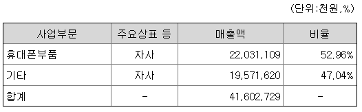 당사는 당기말 현재 휴대폰부품, 기타라는 2가지 사업분야를 영위하고 있습니다.