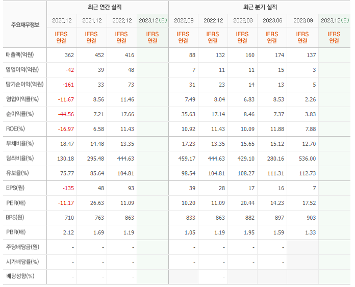 2022년 매출은 416억, 영업이익은 48억, 당기순이익은 73억입니다. 그리고 영업이익률은 11.46%입니다.
