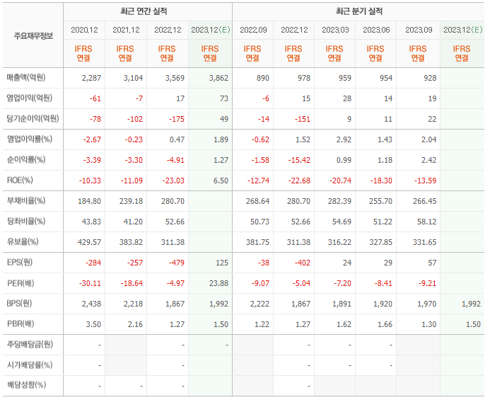 2022년 매출은 3569억, 영업이익은 17억, 당기순이익은 -175억입니다. 그리고 영업이익률은 0.47%입니다.