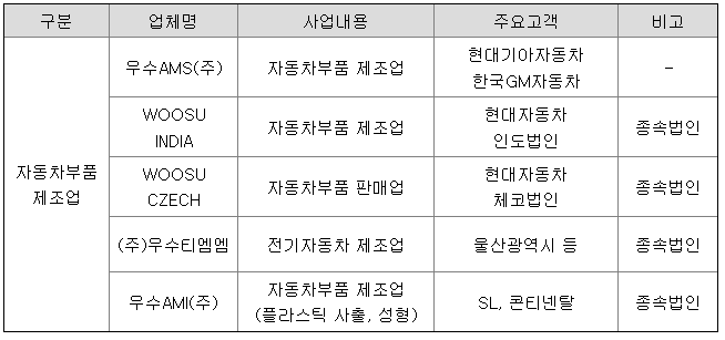당사는 자동차 부품 전문 생산 업체로서 조향부품, 구동부품 등 자동차부품의 제조를 그 주된 사업으로 하고 있으며, 당사에서 생산한 여러 부품들이 국내시장에서 생산되고 있는 승용차 및 상용차 등 전 차종에 다양하게 공급되고 있습니다.